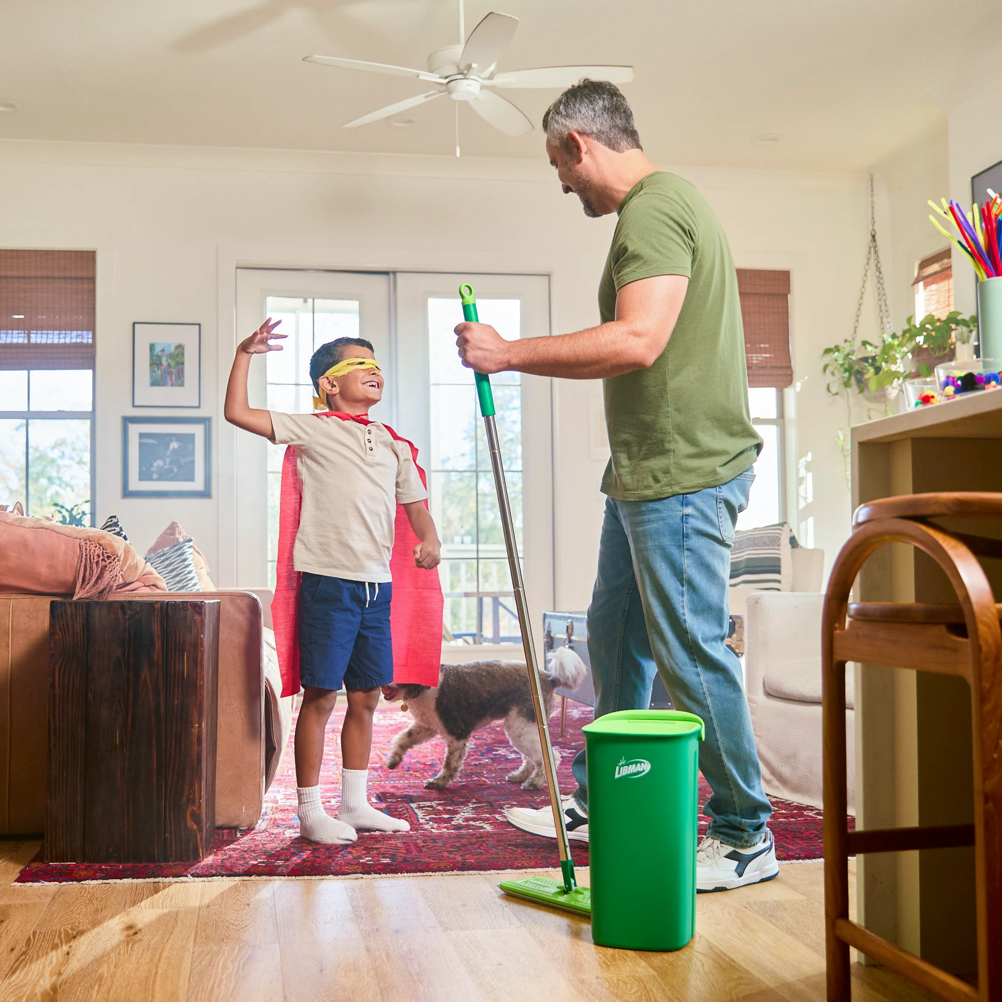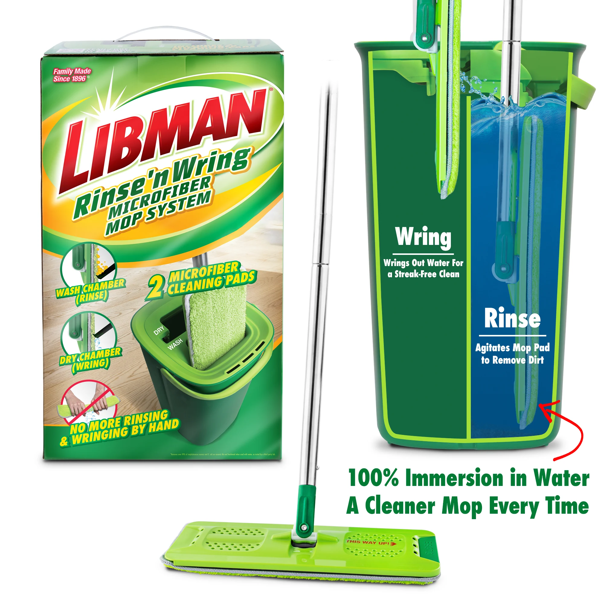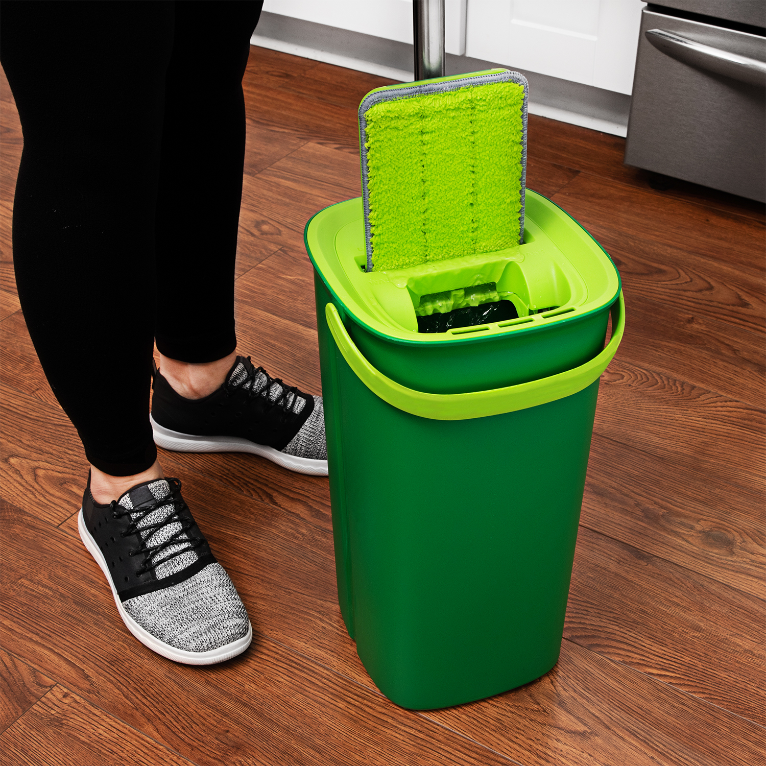 Add this versatile mop to your list of cleaning supplies! The mop bucket has a dual chamber system that works to remove water and dirt efficiently from the mop head. It is safe to use on all hard surfaces, including hardwood, vinyl, laminate, tile, linoleum, and more, but tough enough for larger messes. The Rinse ‘n Wring™ microfiber pads are machine-washable, and the system comes with one additional microfiber head (two pads total).