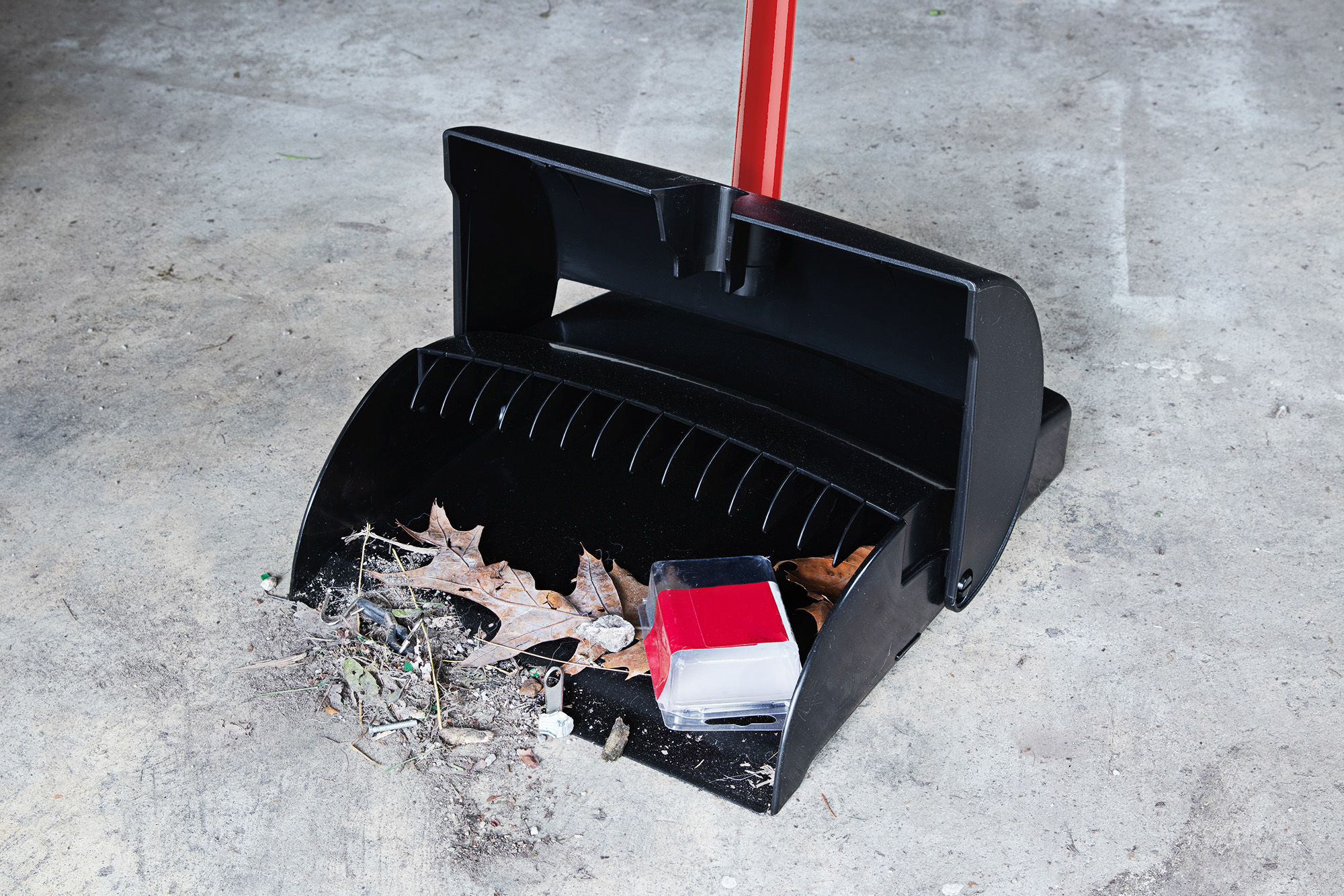 The built-in tilt allows you to leave the pan open. The dustpan includes a closed lid that clicks closed for easy stand-up. The molded teeth easily remove debris from broom fibers.