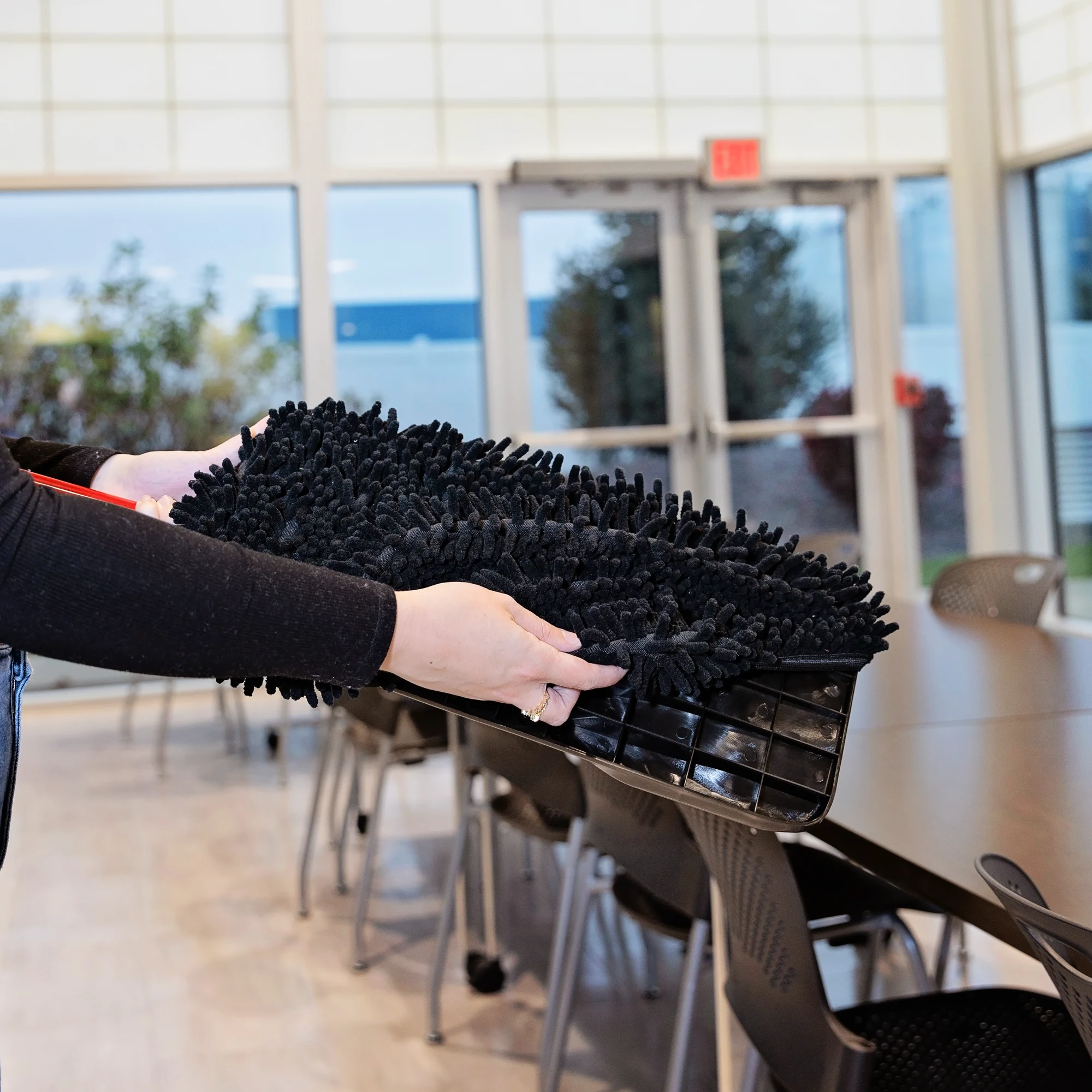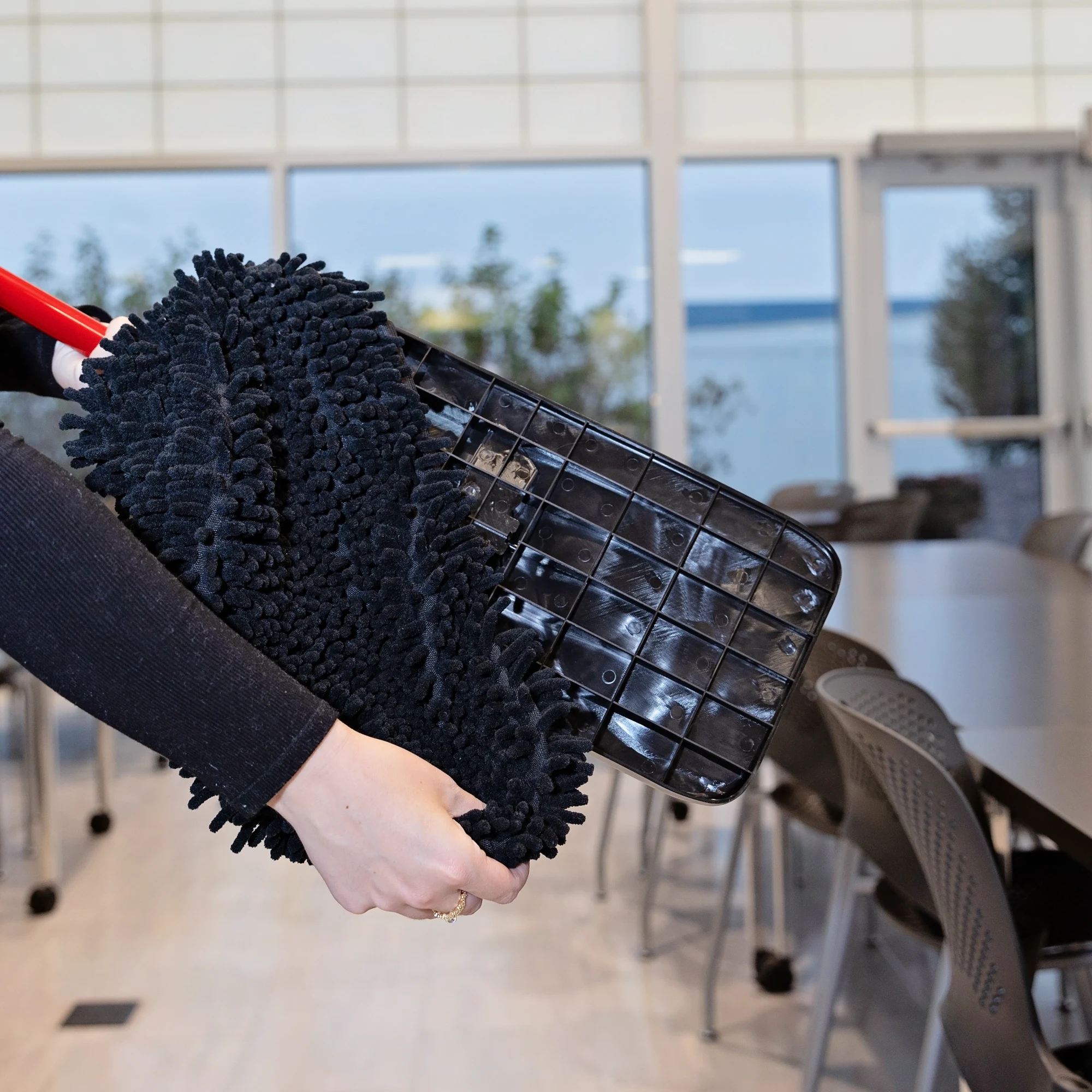 The Extra-Large Microfiber Floor Mop is an extra-large commercial-strength microfiber finger-style dust mop with a unique 360° swivel connector.