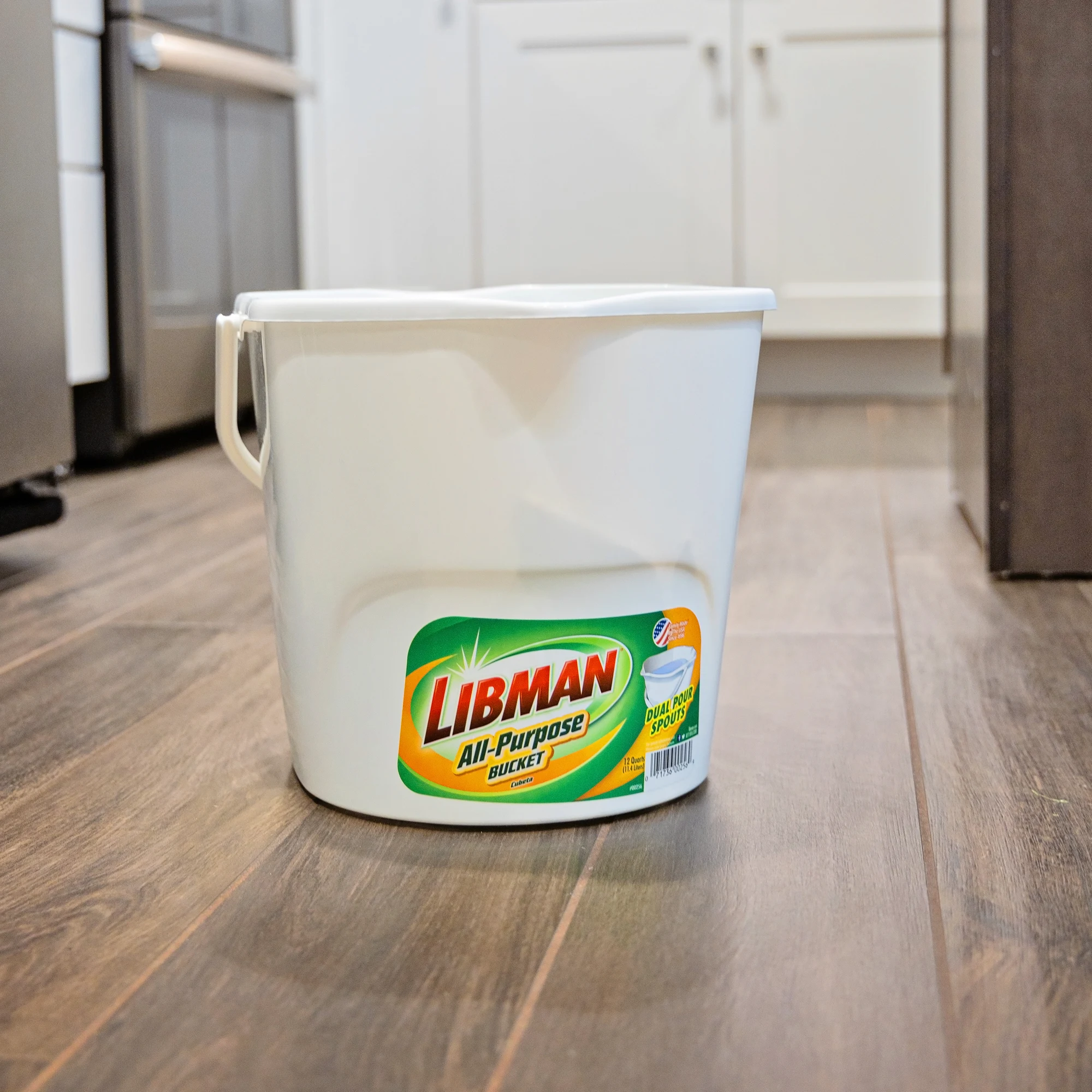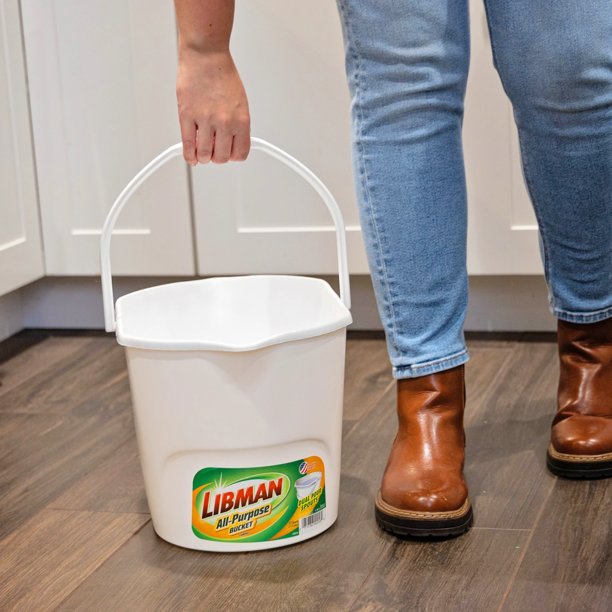 The All-Purpose Bucket has a 3-gallon capacity and features dual-sided spouts for easy liquid removal. It also carries household tools like sponges, rags, and cleaning products for easy access.