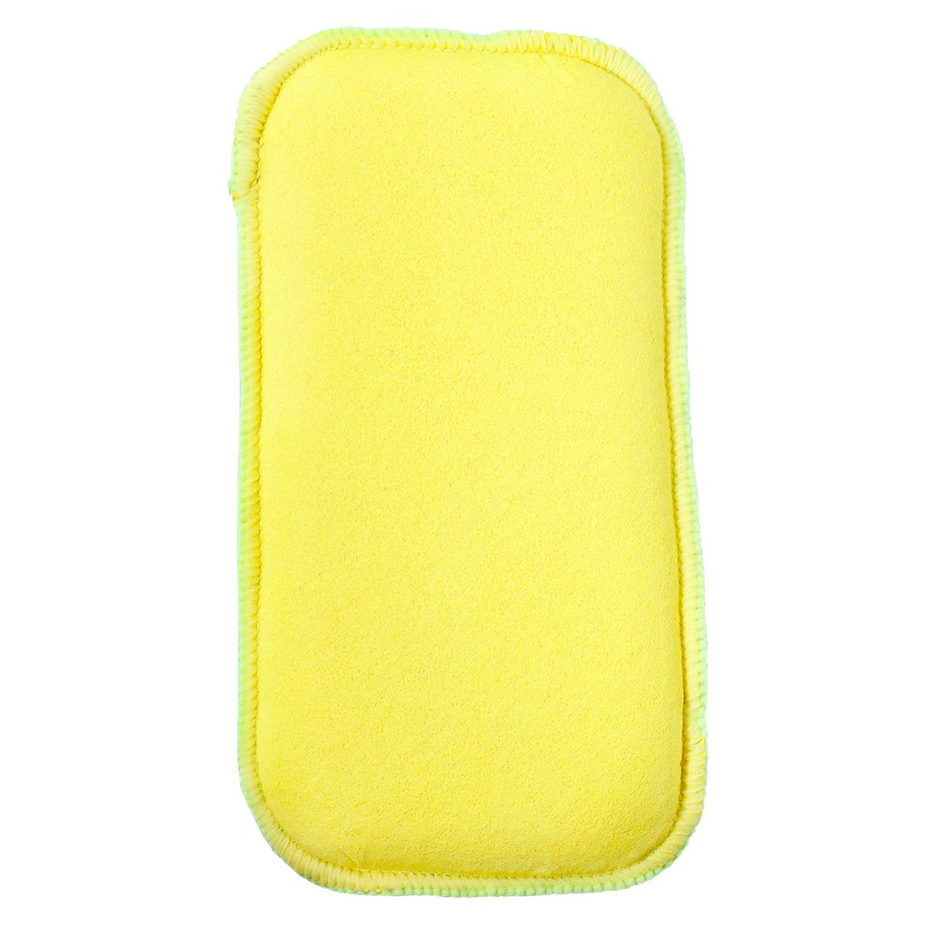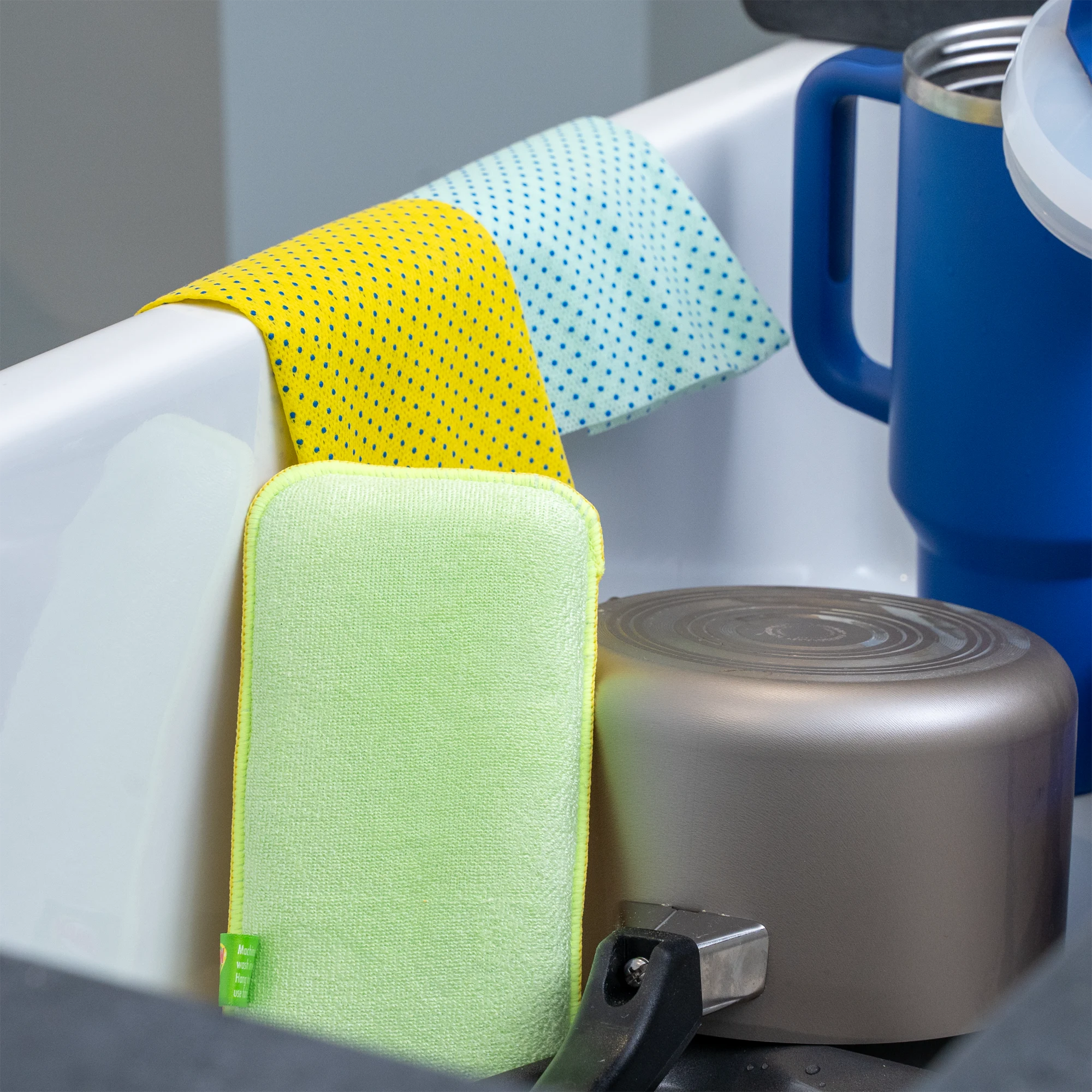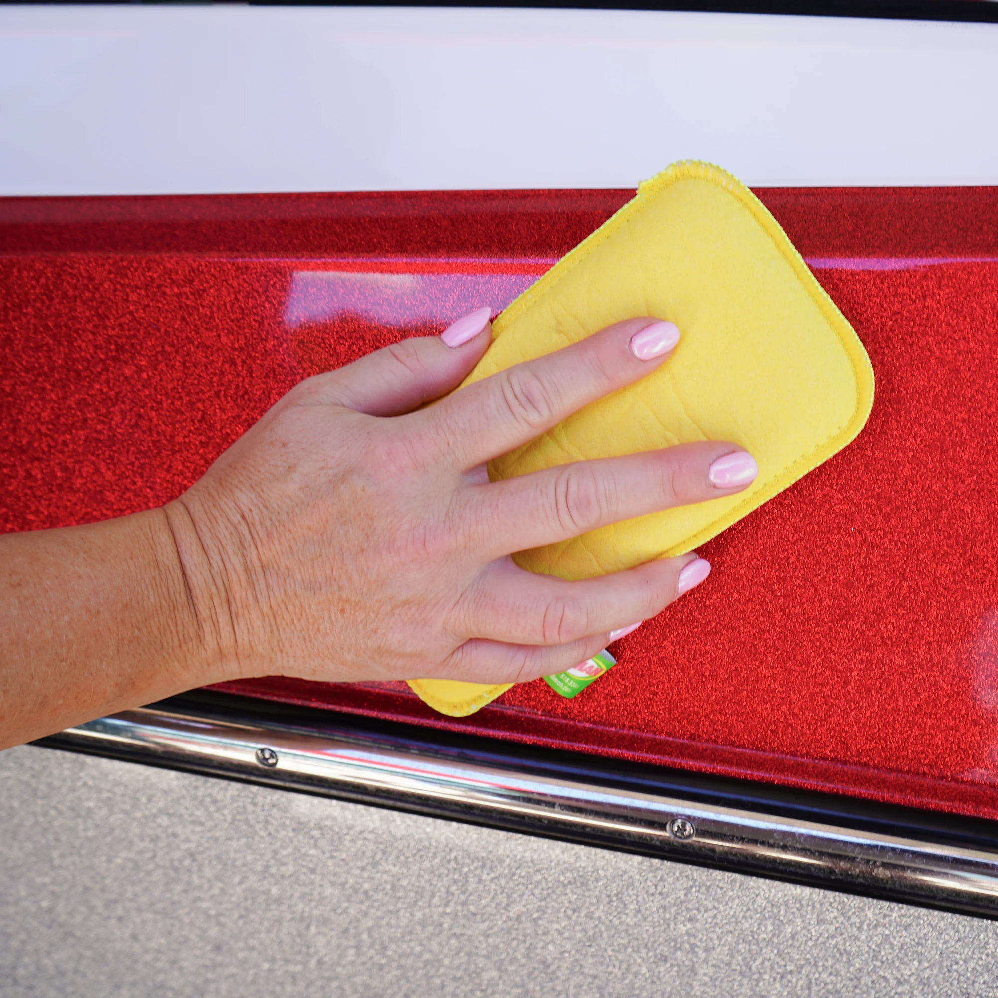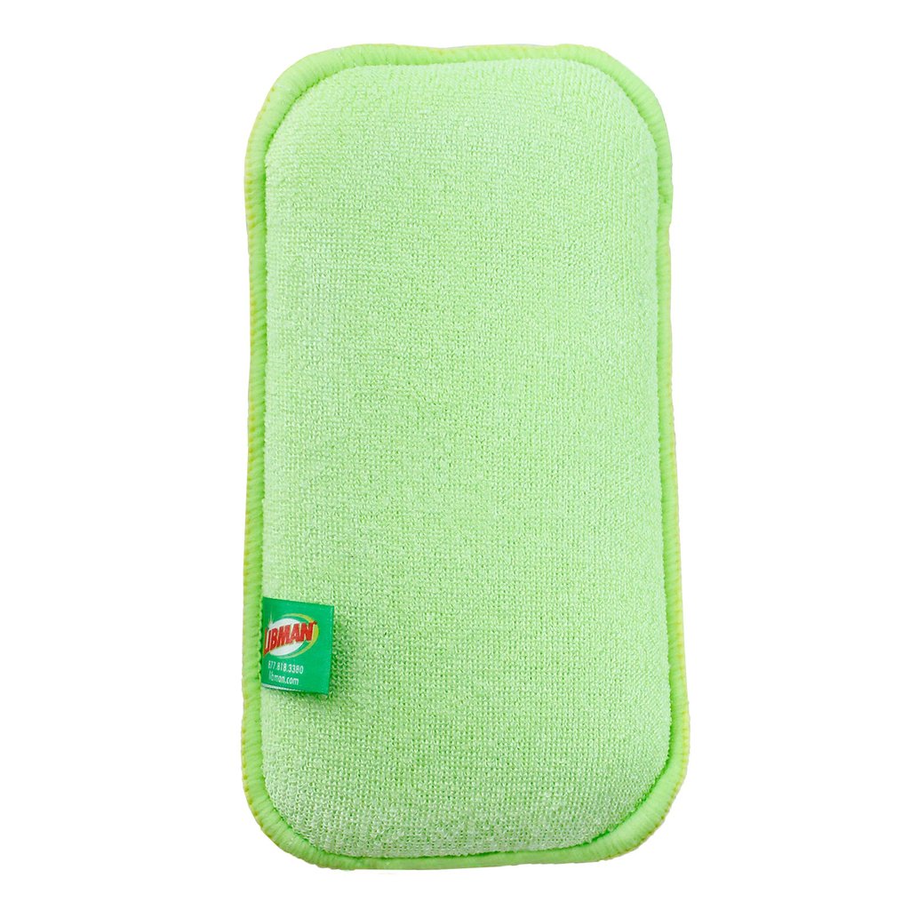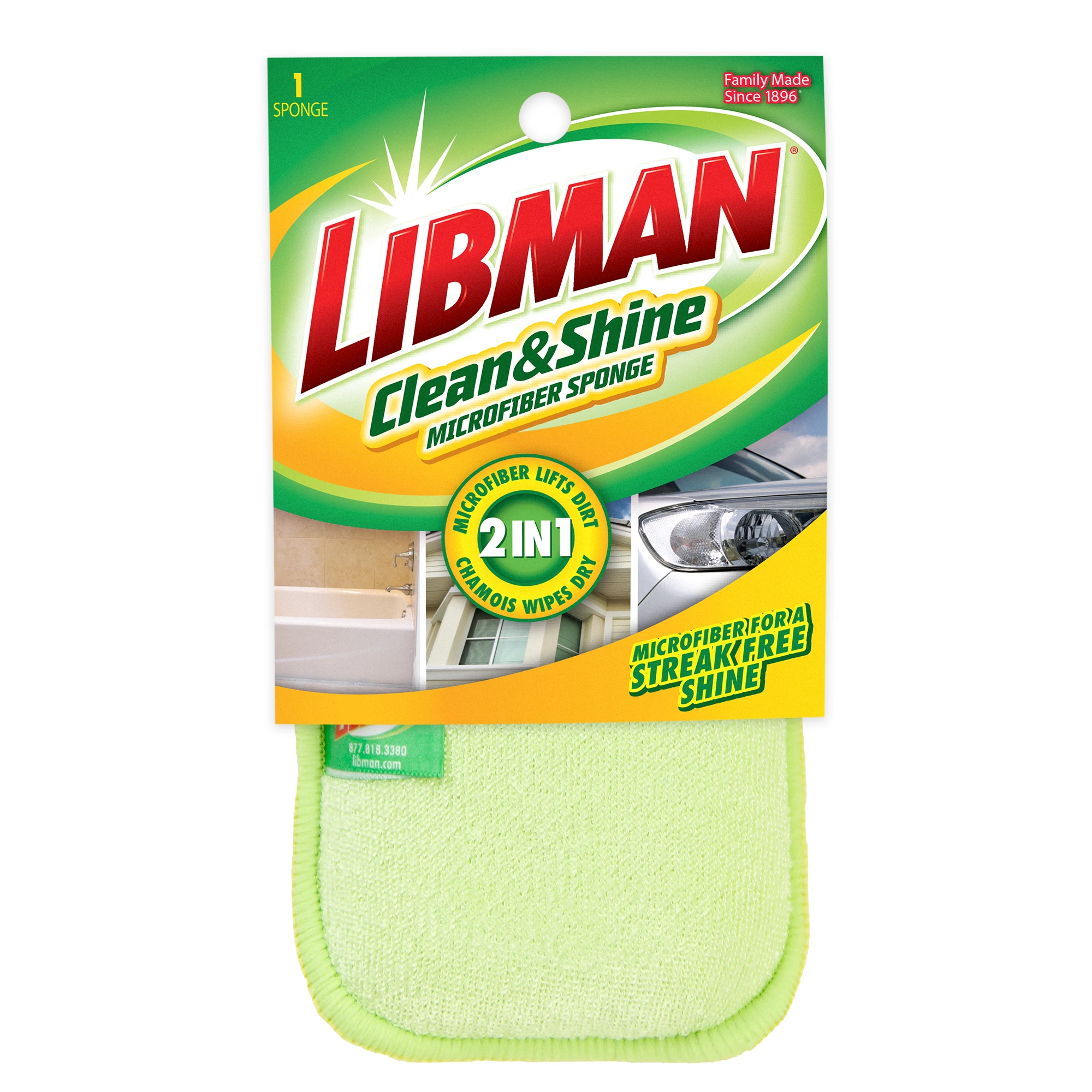 The Clean & Shine Microfiber Sponge is a 2-in-1 cleaner for wet and dry surfaces. One side features a microfiber surface that lifts dirt, while the other has a chamois surface that wipes glass dry.