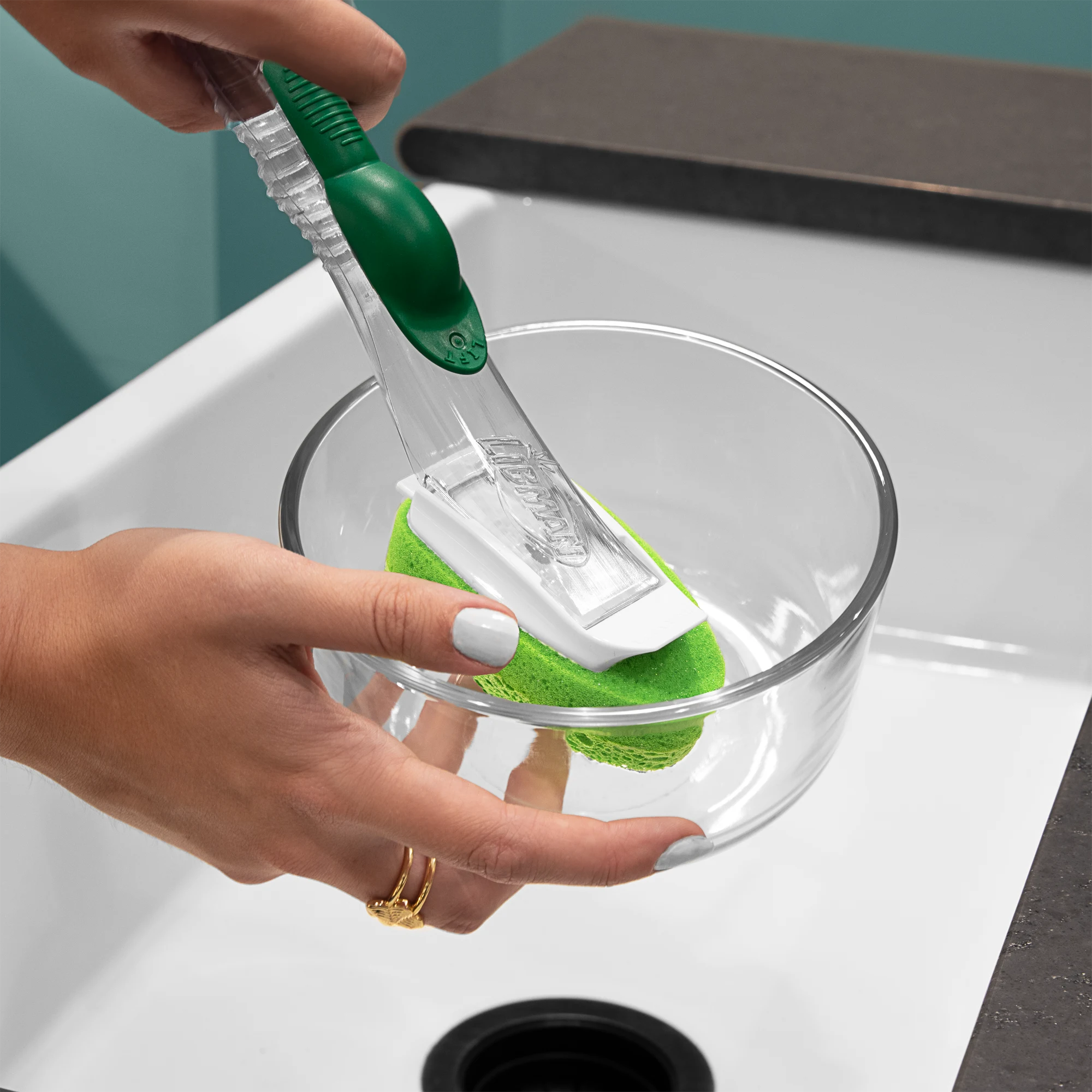 The Gentle-Touch Foaming Dish Wand features a sturdy, contoured handle with a rubber soap-dispensing button for easy refilling. Its durable, ergonomic design fits into tight spaces and corners for thorough cleaning.