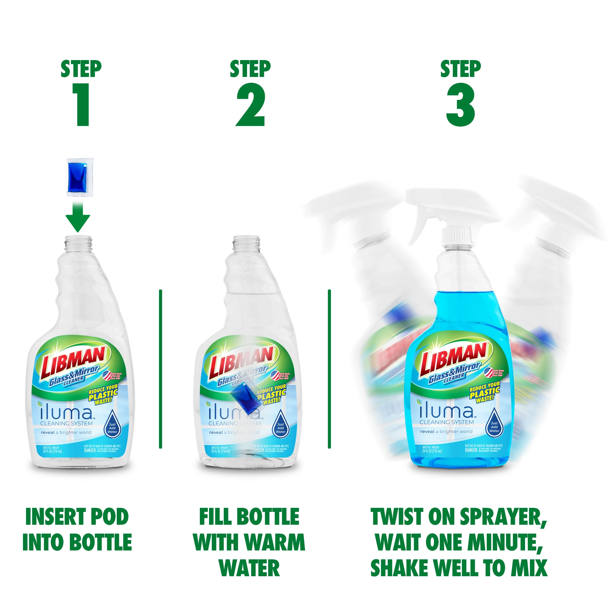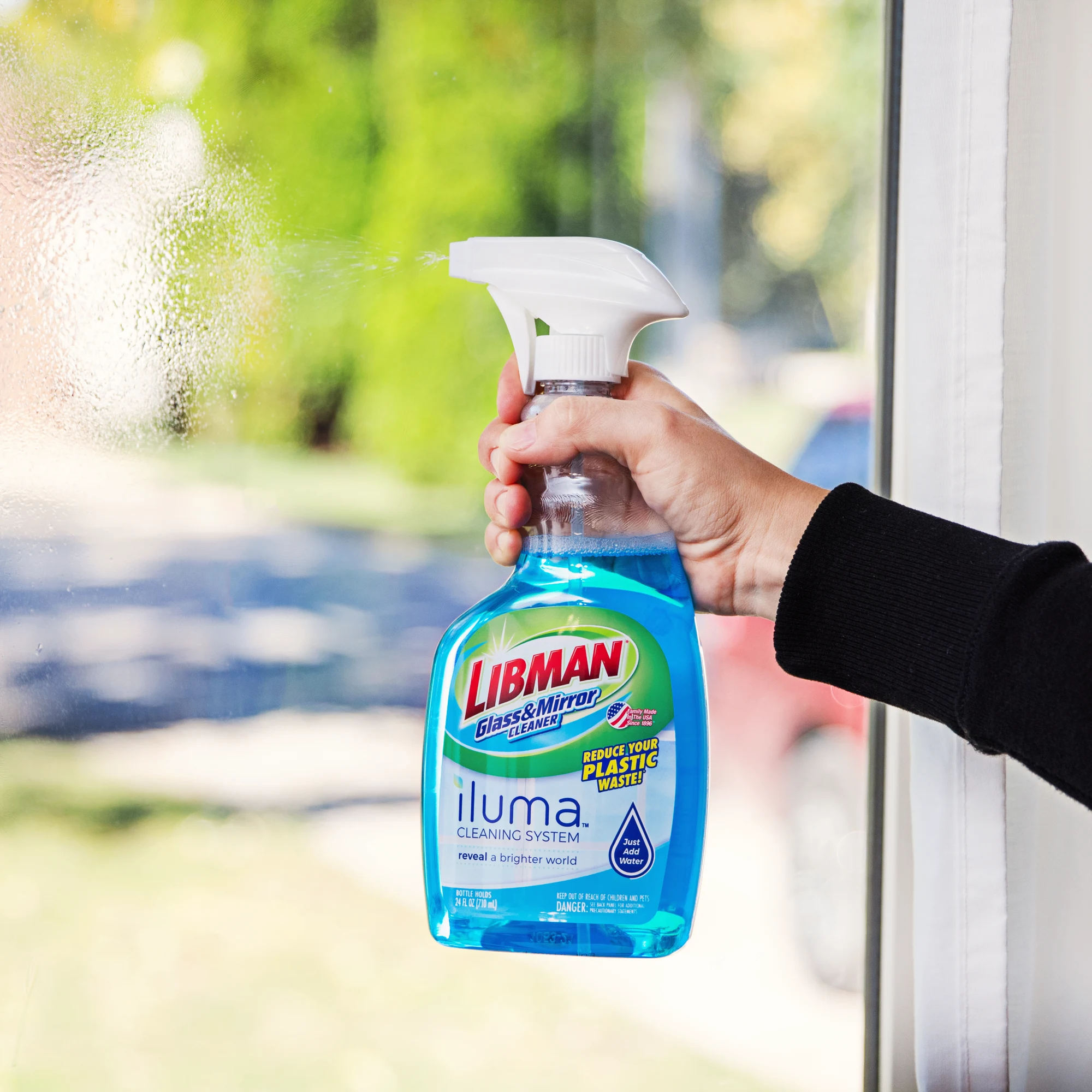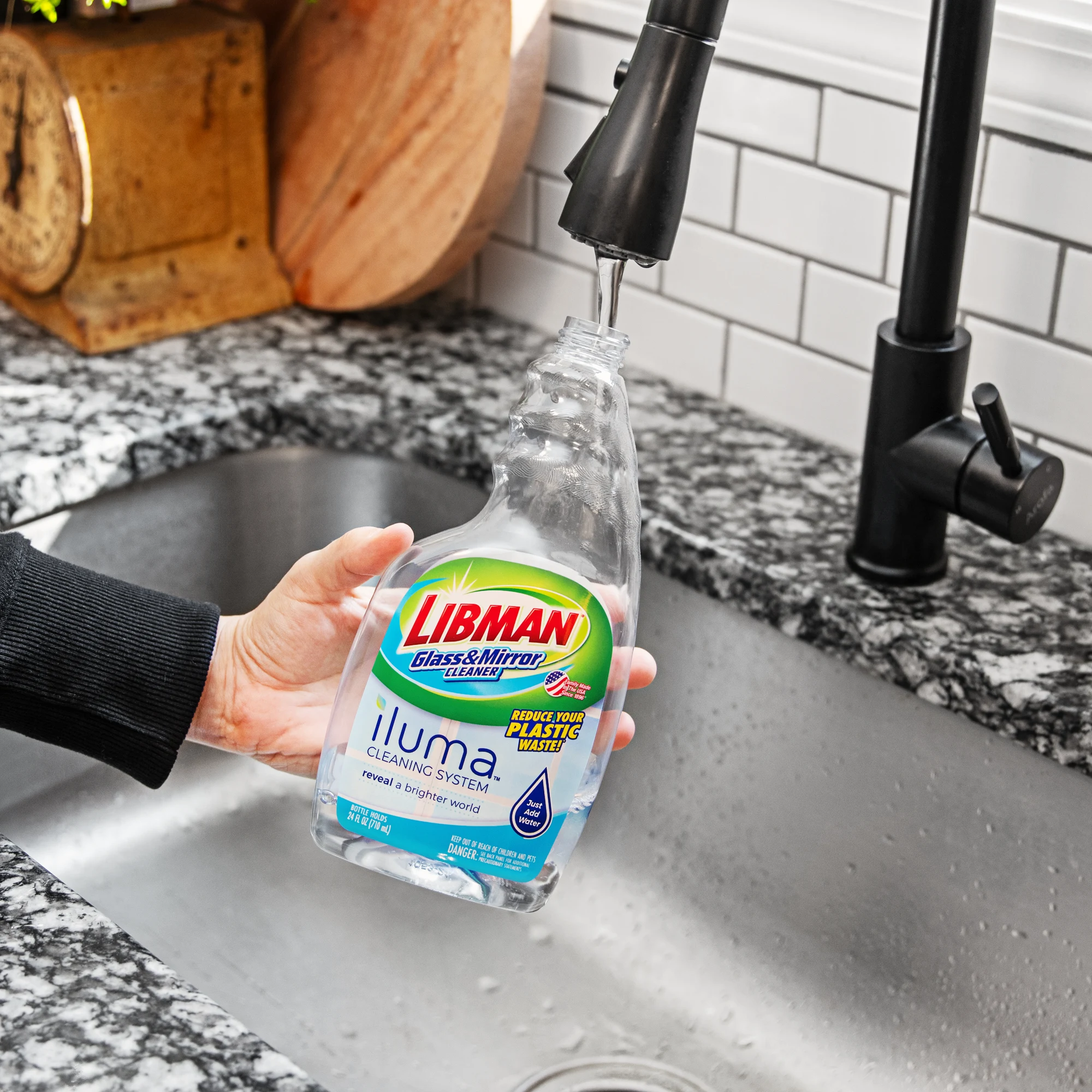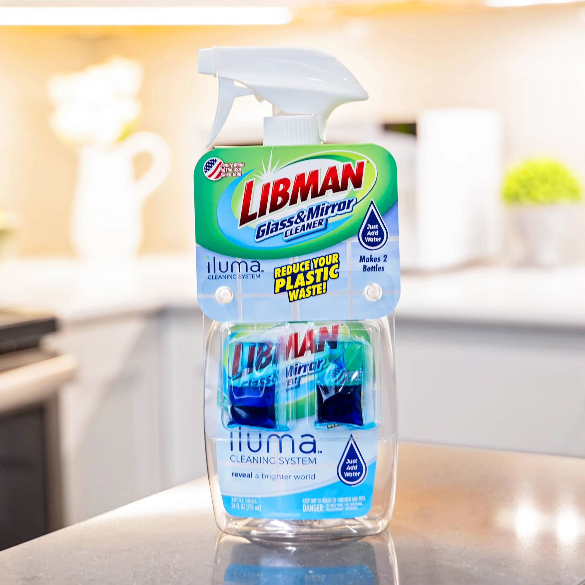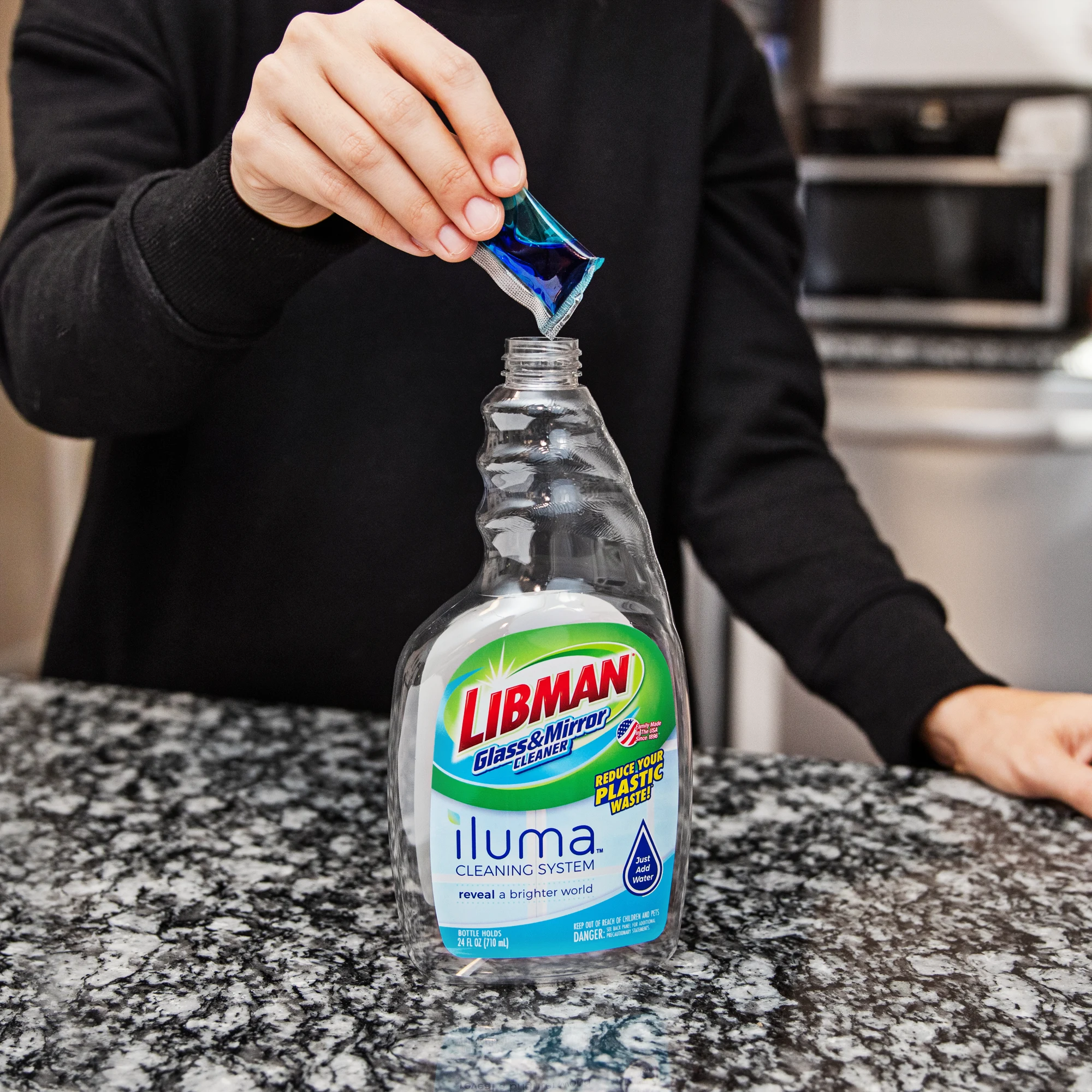 Reduce your plastic waste and clean your glass, chrome, and mirrors more completely with the iluma™ Concentrated Cleaning System. At the Libman Company, we believe in creating quality products with cutting-edge technology to make life easier for you and reduce waste in the process. The iluma™ Concentrated Cleaning System reduces plastic waste and carbon footprints by reusing plastic containers, and reducing your waste from plastic cleaning bottles by up to 90%! This concentrated glass and mirror cleaner comes with 2 liquid pods to mix with water for a more environmentally friendly cleaning option. With convenient iluma™ refills, you can reuse the included bottle up to 10 times.