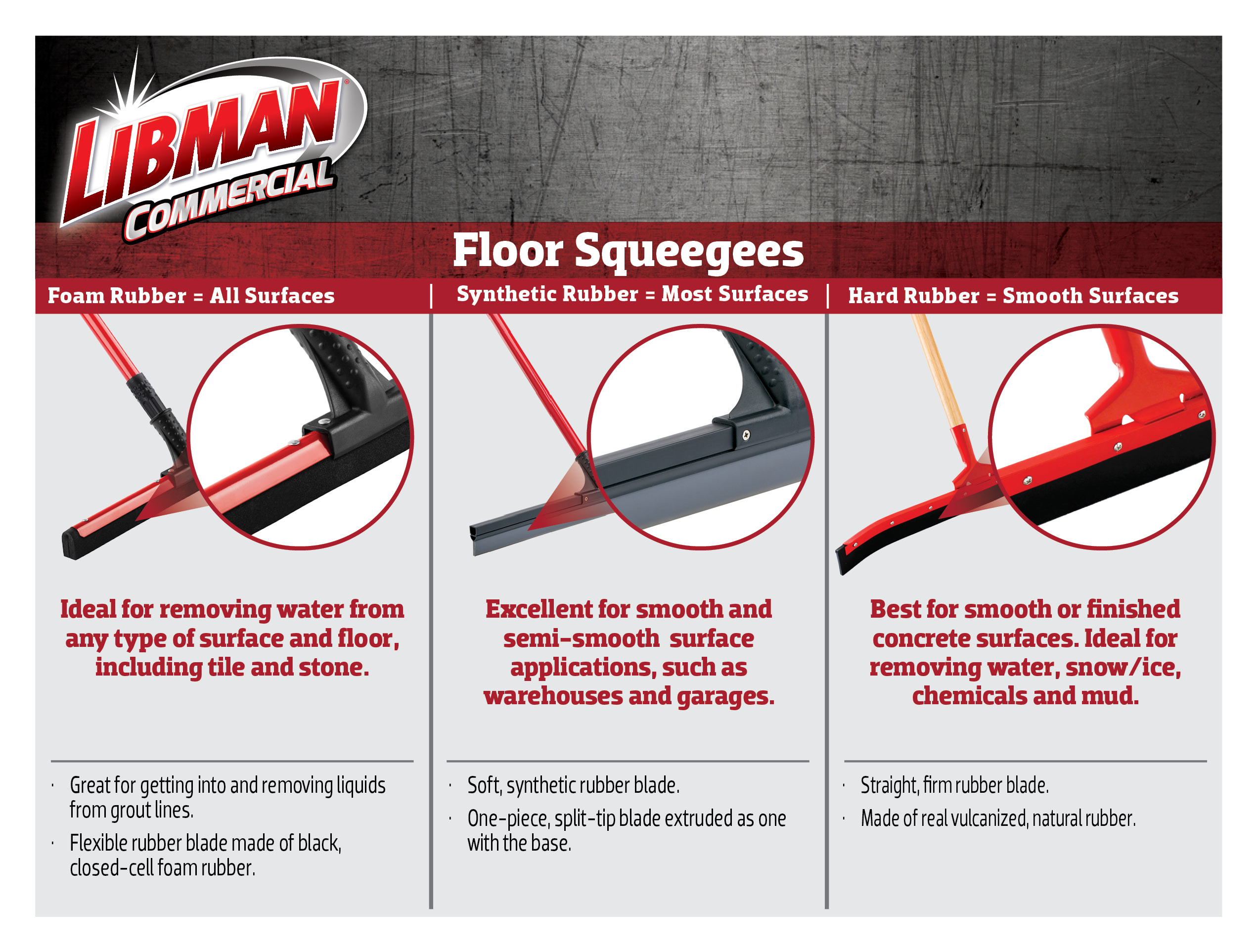 - Straight, firm rubber blade mounted with a curve to remove and contain water