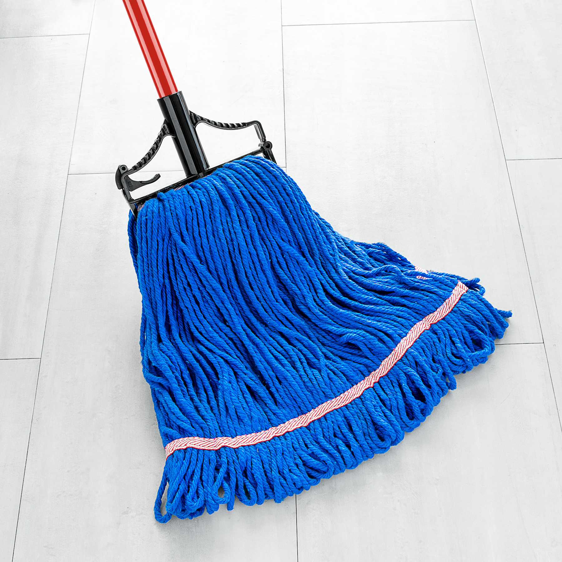 The Premium Blue-Blend Wet Mop is a commercial-strength string-style mop. It features a looped-end, premium blue blend of cotton and synthetic yarn.
