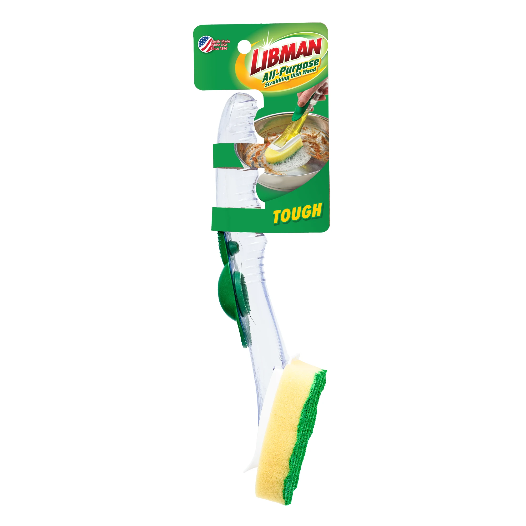 The All-Purpose Scrubbing Dish Wand has a sturdy handle with a contoured grip that’s perfect for soap-filling through the rubber lifting button. The sponge’s rinse-clean design is shaped to fit in all corners and spaces with an integrated scraper.
