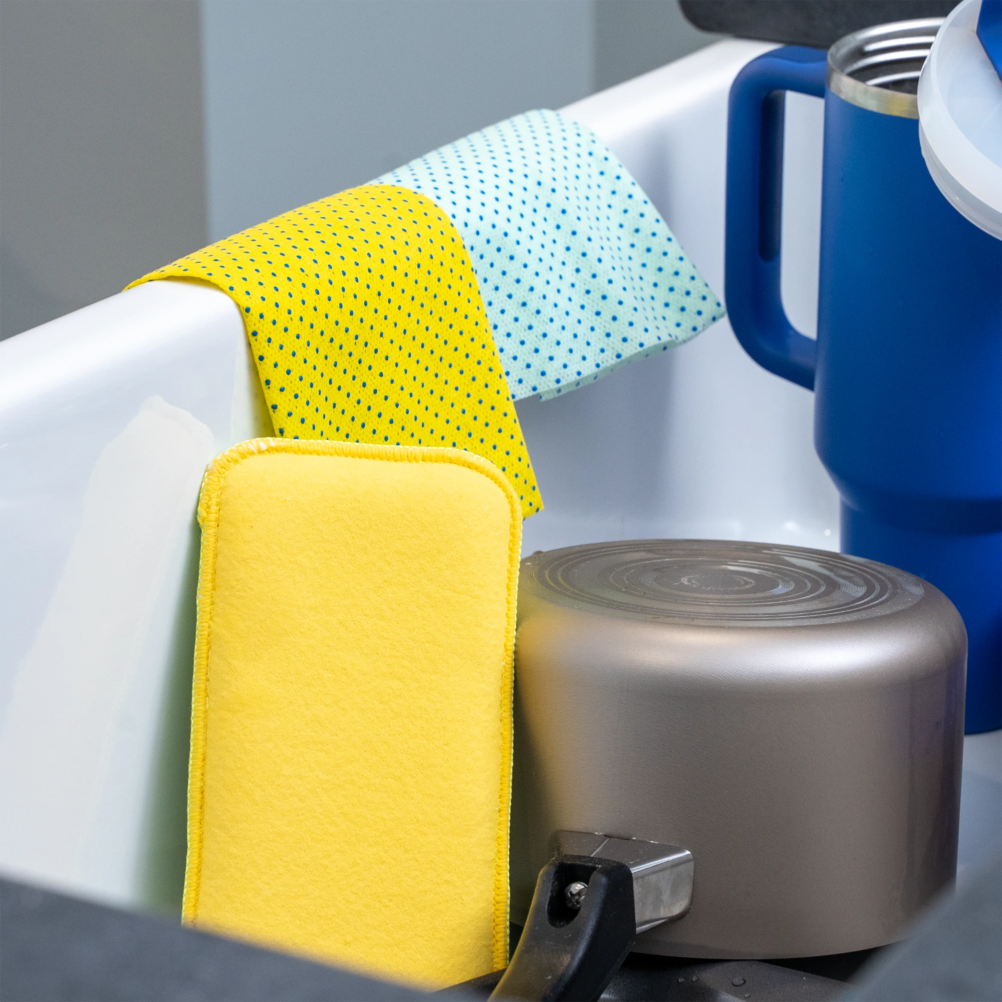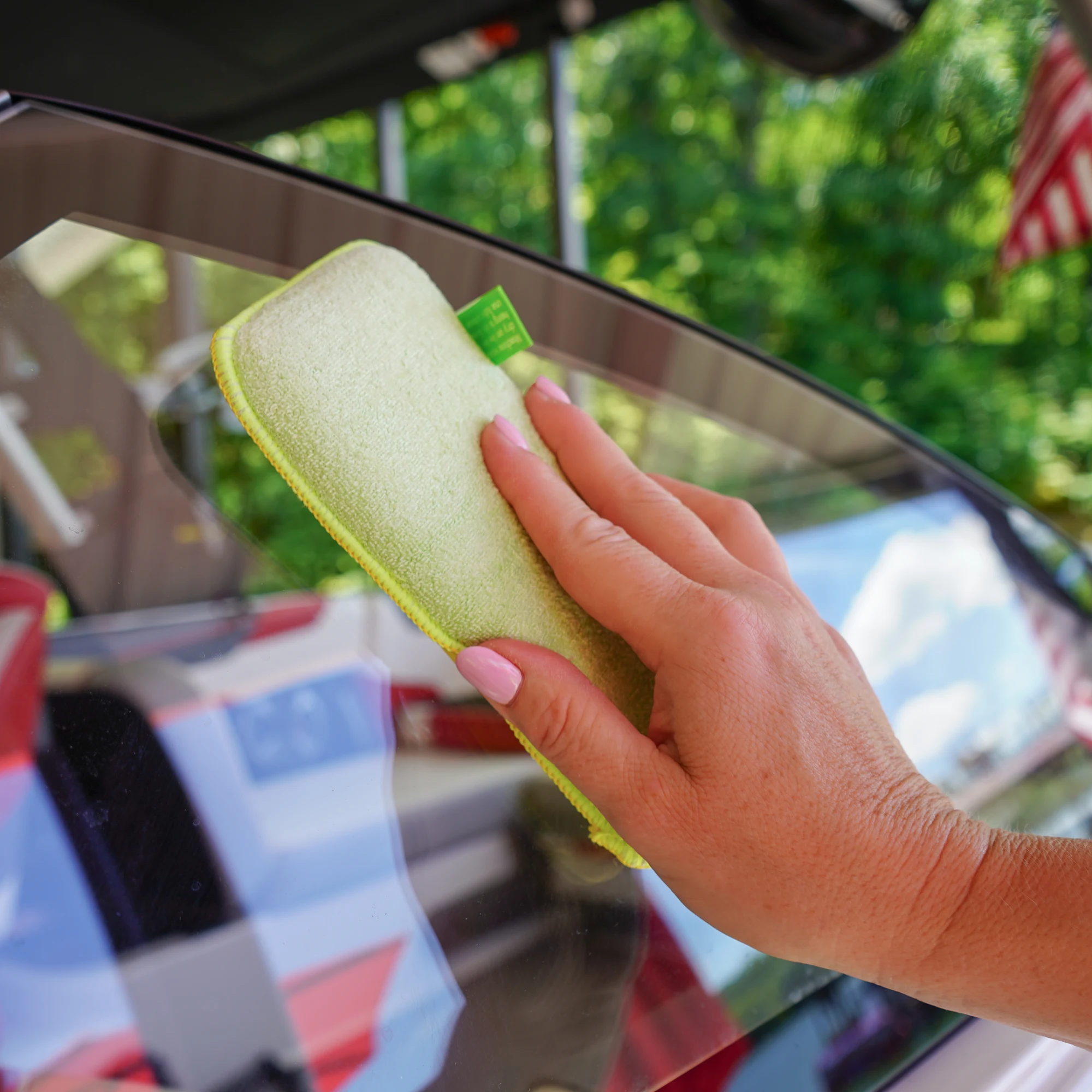 The Clean & Shine Microfiber Sponge is a 2-in-1 cleaner for wet and dry surfaces. One side features a microfiber surface that lifts dirt, while the other has a chamois surface that wipes glass dry.